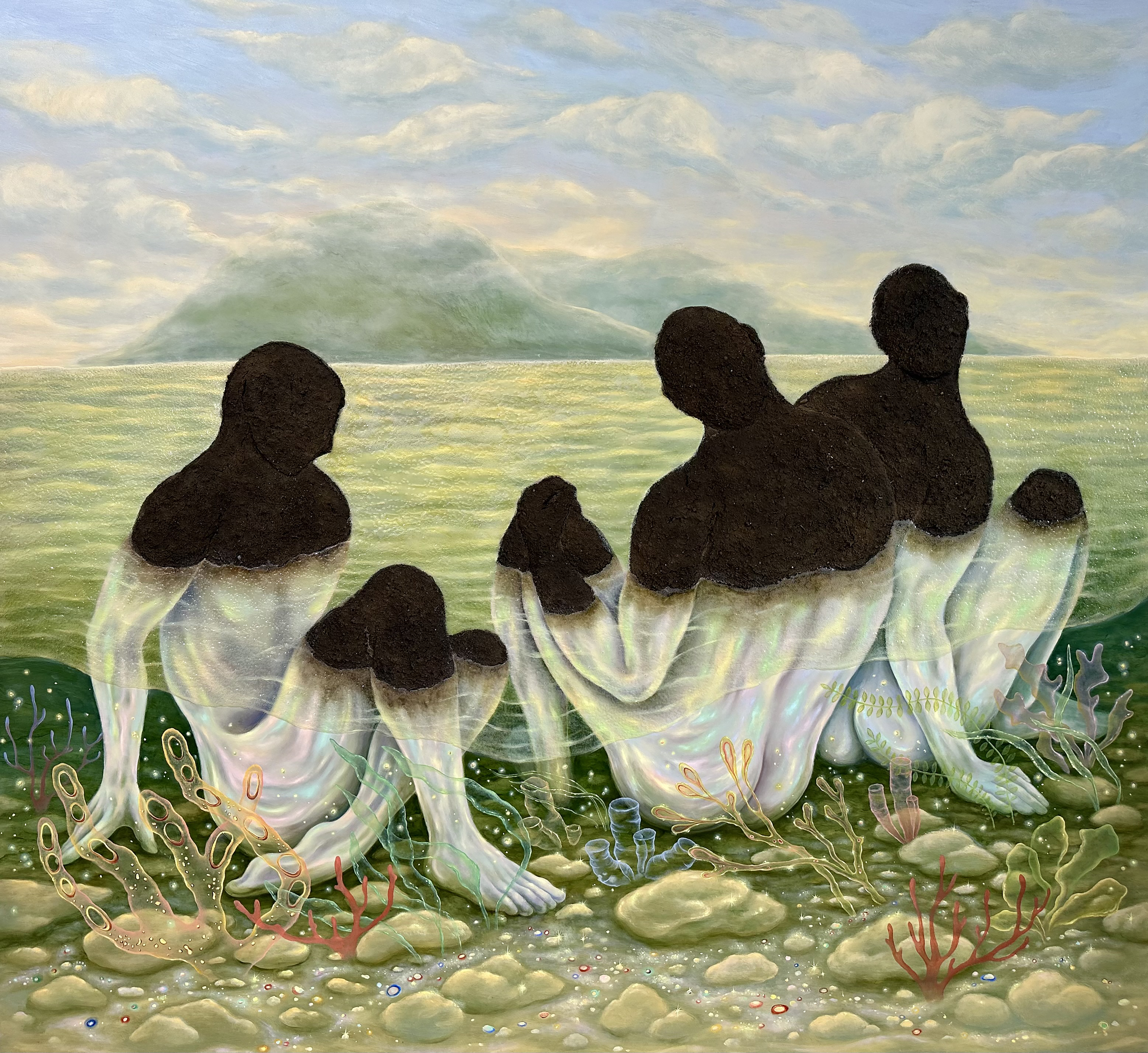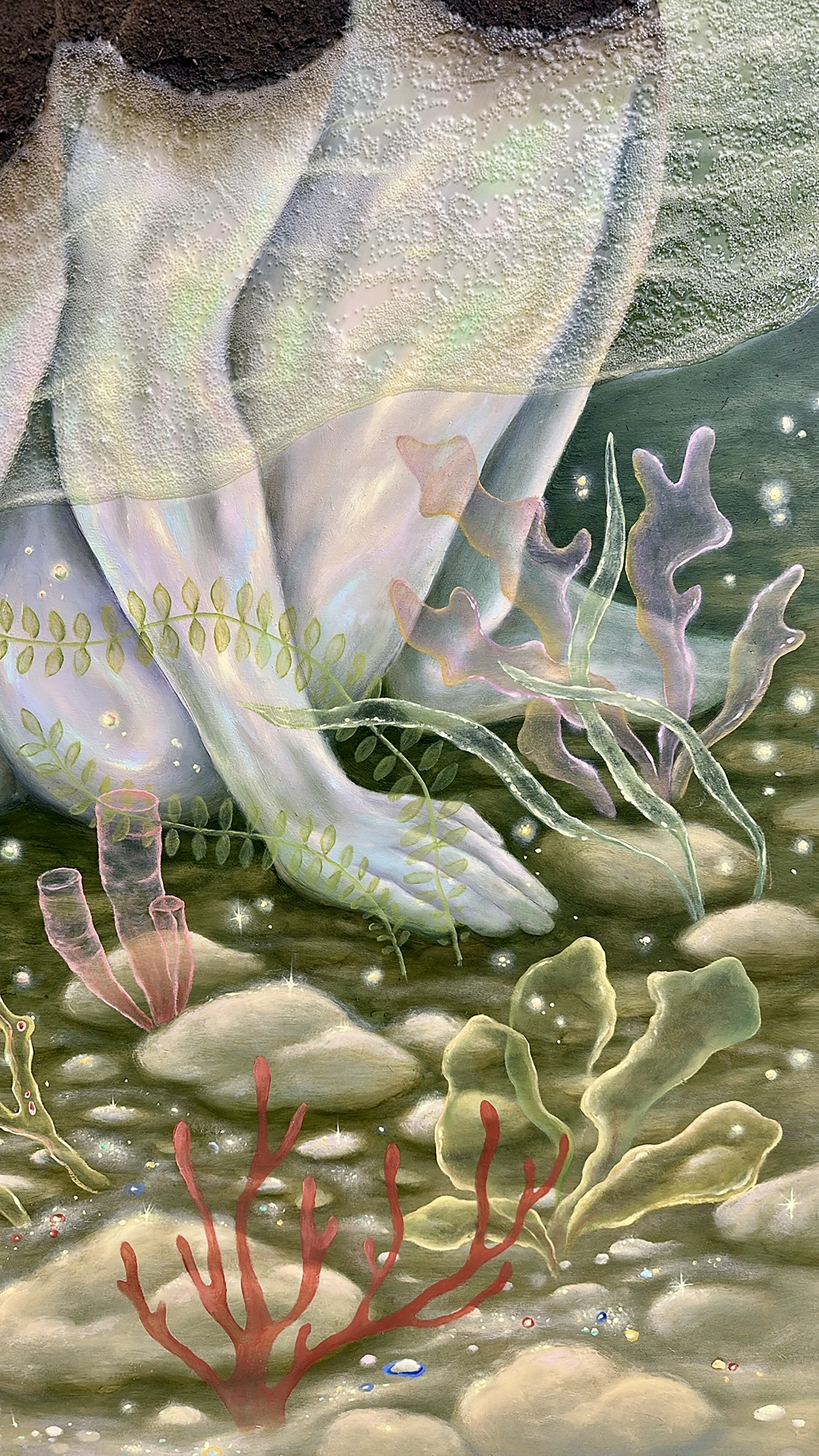 oil on wood panel, resin, soil