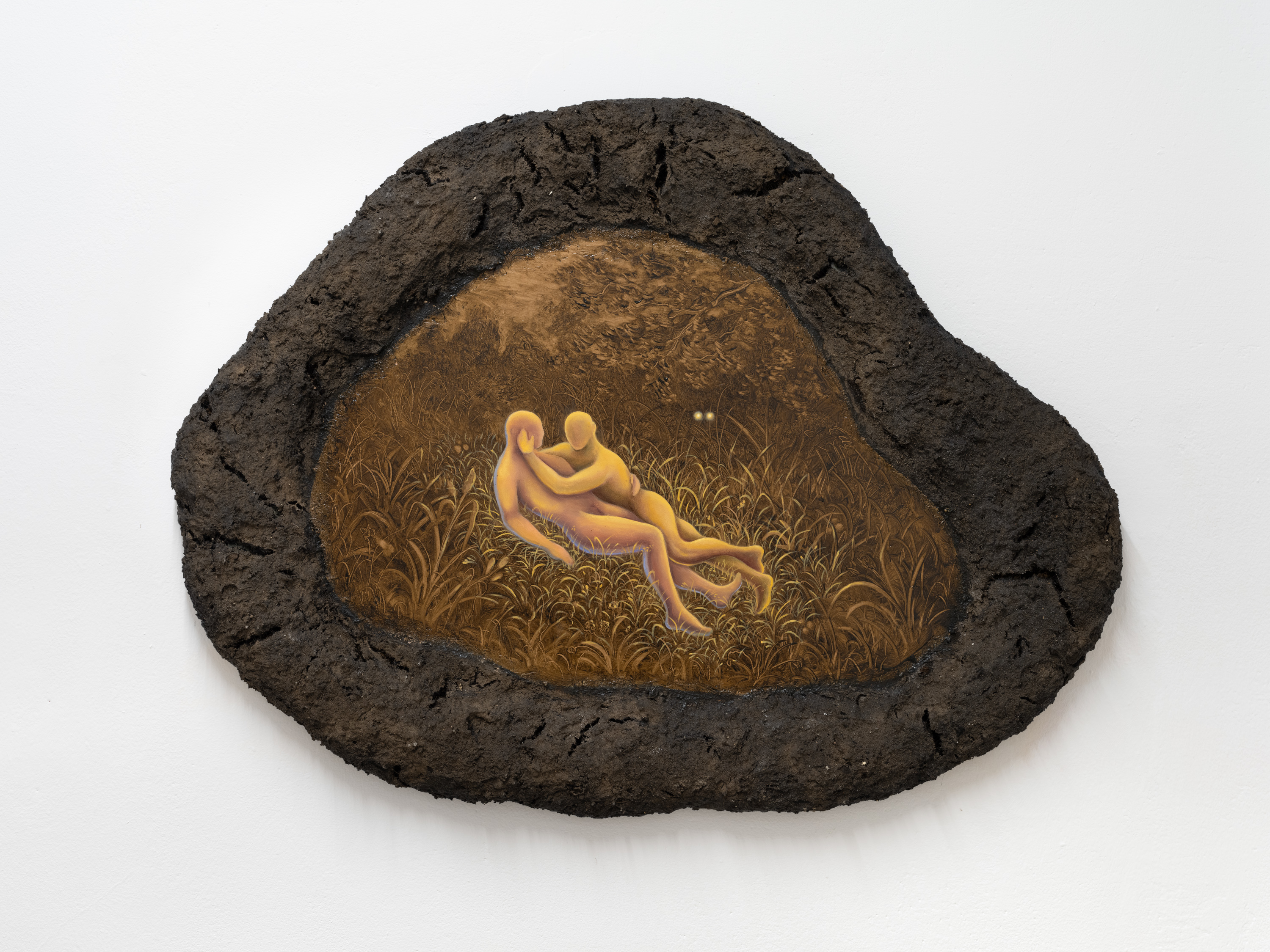 EN The painting references moralizing Bible depictions, showing two same-sex couples in a loving embrace, while two laughing devils watch. Here, the devil is replaced by eyes in the darkness, symbolizing the all-seeing power and control over people’s private lives.